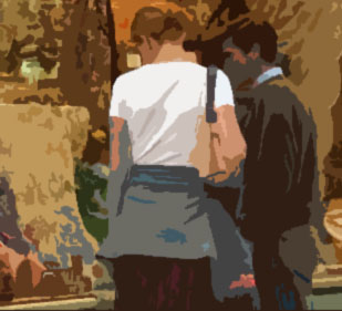 En aquel momento se acerca una pareja, ella mirando distraídamente los escaparates y él con un pequeño receptor en la mano totalmente ausente escuchando por los auriculares. Al llegar junto al banco, la mujer deja caer una moneda sobre un periódico del suelo, luego se dirigen hacia el semáforo indiferente y orgullosa.
